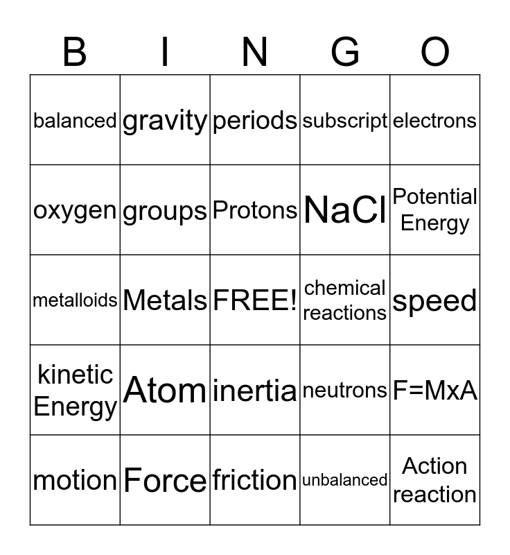 This bingo card has a free space and 24 words: Atom, Force, Protons, motion, electrons, balanced, oxygen, gravity, chemical reactions, inertia, NaCl, metalloids, neutrons, F=MxA, groups, unbalanced, speed, periods, Potential Energy, Metals, Action reaction, kinetic Energy, subscript and friction.