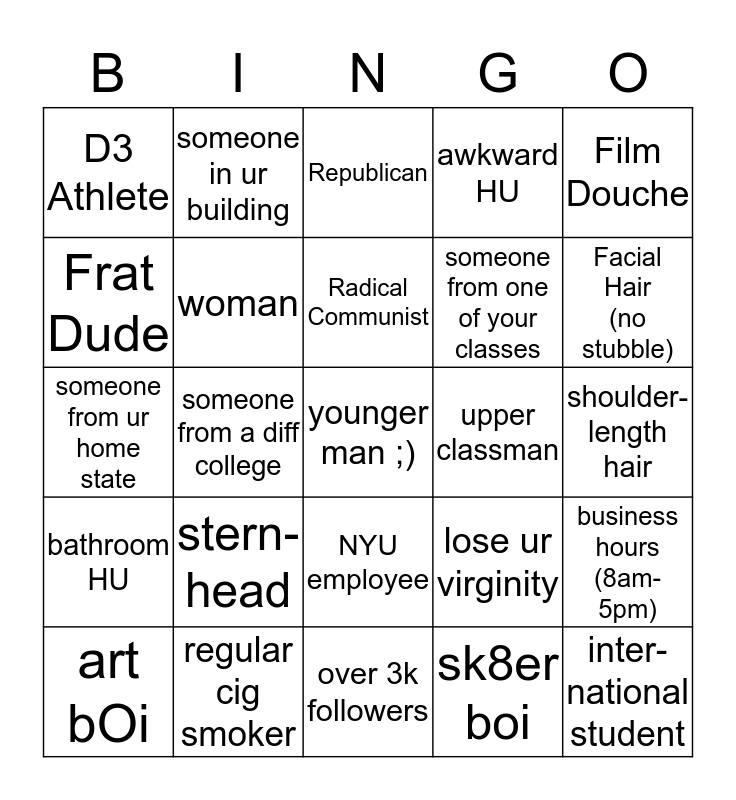 This bingo card has 25 words: stern-head, over 3k followers, Radical Communist, art bOi, Film Douche, D3 Athlete, Frat Dude, someone in ur building, upper classman, NYU employee, someone from one of your classes, someone from ur home state, lose ur virginity, business hours (8am-5pm), woman, inter-national student, shoulder-length hair, Republican, Facial Hair (no stubble), someone from a diff college, younger man ;), regular cig smoker, bathroom HU, awkward HU and sk8er boi.