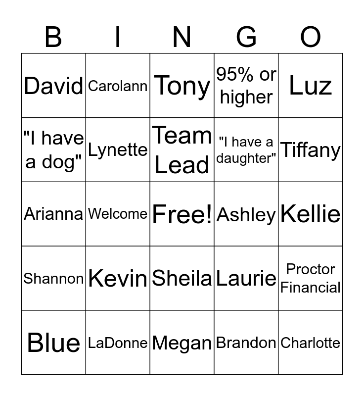 This bingo card has a free space and 29 words: Blue, EMS, Welcome, Manager, David, Tony, Lynette, Kevin, Ashley, LaDonne, Kellie, Charlotte, Megan, Brandon, Tiffany, Jason, Sheila, Shannon, Luz, Arianna, Laurie, Red, "I have a daughter", "I have a dog", 95% or higher, Carolann, Proctor Financial, Team Lead and Quality Auditor.