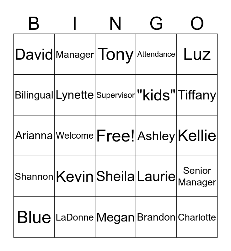 This bingo card has a free space and 29 words: Blue, Quality, Welcome, Manager, David, Tony, Lynette, Kevin, Ashley, LaDonne, Kellie, Charlotte, Megan, Brandon, Tiffany, Jason, Sheila, Shannon, Luz, Arianna, Laurie, Red, "kids", Bilingual, Attendance, Manager, Senior Manager, Supervisor and Proctor Financial.