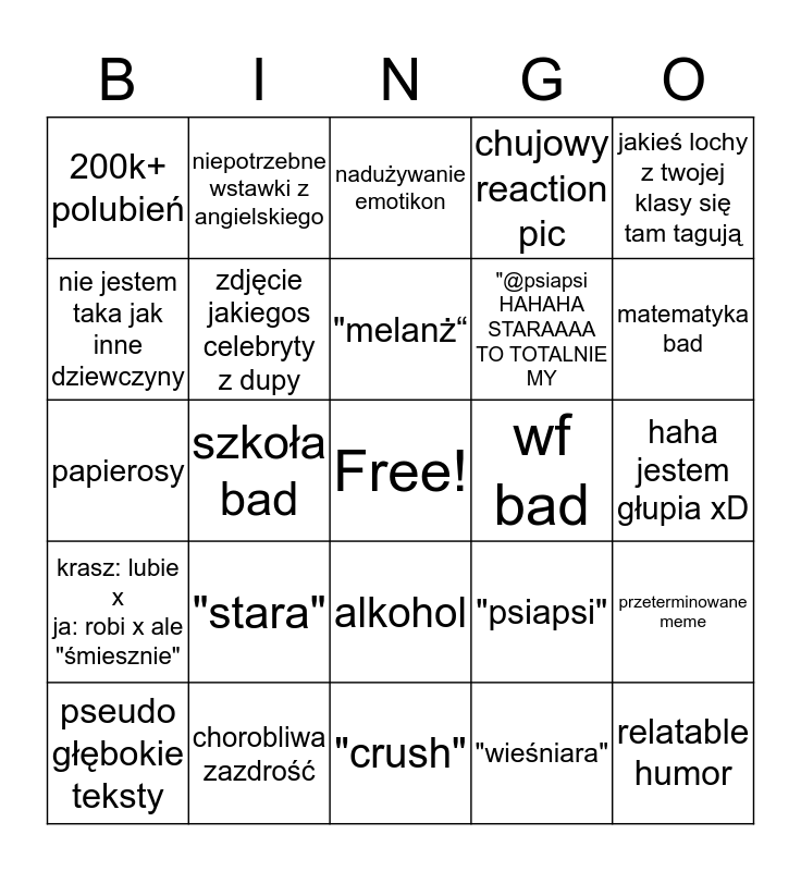 This bingo card has a free space and 24 words: "stara", chorobliwa zazdrość, "melanż“, pseudo głębokie teksty, jakieś lochy z twojej klasy się tam tagują, 200k+ polubień, nie jestem taka jak inne dziewczyny, niepotrzebne wstawki z angielskiego, wf bad, alkohol, "@psiapsi HAHAHA STARAAAA TO TOTALNIE MY, papierosy, "psiapsi", przeterminowane meme, zdjęcie jakiegos celebryty z dupy, "wieśniara", haha jestem głupia xD, nadużywanie emotikon, matematyka bad, szkoła bad, relatable humor, krasz: lubie x ja: robi x ale "śmiesznie", chujowy reaction pic and "crush".