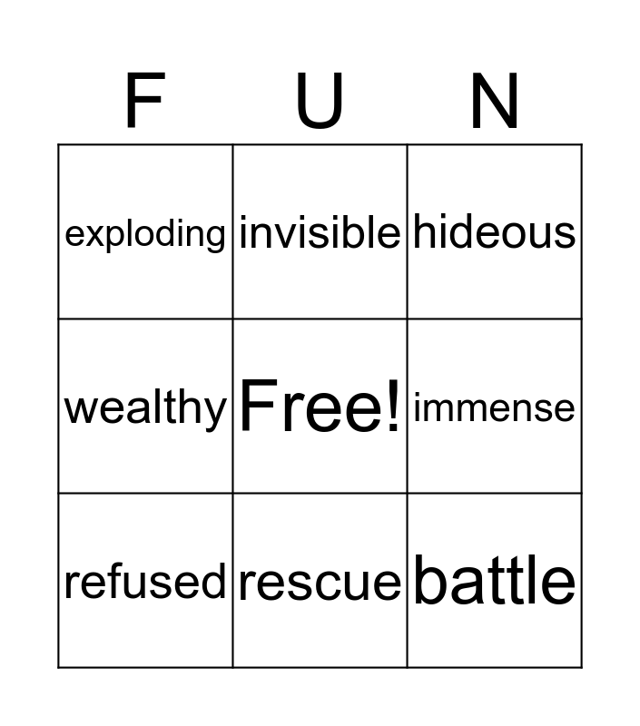 This bingo card has a free space and 10 words: rescue, hideous, exploding, battle, wealthy, refused, invisible, hired, immense and warrior.