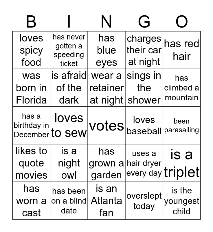 This bingo card has 25 words: is a night owl, is an Atlanta fan, wear a retainer at night, has worn a cast, has red hair, loves spicy food, was born in Florida, has never gotten a speeding ticket, loves baseball, has grown a garden, sings in the shower, has a birthday in December, uses a hair dryer every day, is a triplet, is afraid of the dark, is the youngest child, been parasailing, has blue eyes, has climbed a mountain, loves to sew, votes, has been on a blind date, likes to quote movies, charges their car at night and overslept today.