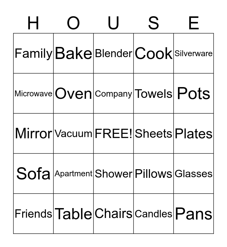 This bingo card has a free space and 24 words: Apartment, Table, Company, Friends, Silverware, Family, Microwave, Bake, Sheets, Shower, Towels, Mirror, Pillows, Glasses, Oven, Candles, Plates, Blender, Pots, Vacuum, Pans, Sofa, Cook and Chairs.