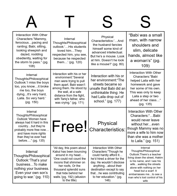 This bingo card has 18 words: Free!, Internal Thoughts/Philosophical Outlook:There’s a teacher living down the street, Hakim is his name, and I see his wife…walking the streets alone with nothing on her head but a scarf. It embarrasses me…to see a man who’s lost control of his wife, Physical Characteristics:‘…And the husband fancies himself some kind of advanced intellectual. But he’s a mouse. Look at him. Doesn’t he look like a mouse?’ (pg. 80), Interaction With Other Characters:“Mammy, ferocious…pacing and ranting; Babi, sitting, looking sheepish and dazed, nodding obediently, waiting for the storm to pass.” (pg. 108), Physical Characteristics:, “Babi was a small man, with narrow shoulders and slim, delicate hands, almost like a woman’s” (pg. 109), Internal Thoughts/Philosophical Outlook:‘That’s your business…To make nothing your business. Even your own son’s going to war.’ (pg. 110), Internal Thoughts/Philosophical outlook:‘…His students loved him…They respected him, you see, because he respected them…’ (pg. 120), Interaction With Other Characters:“Babi helped Laila with her homework and gave her some of his own. This was only to keep Laila a step or two ahead of her class…” (pg. 135), Internal Thoughts/Philosophical Outlook:‘Women have always had it hard in this country…but they’re probably more free now…and have more rights than they’ve ever had before….” (pg. 135), Interaction With Other Characters:“Though he could hardly afford it…he’d hired a driver for the day. He wouldn’t disclose anything…about their destination except to say that…he was contributing to her education.” (pg. 146), Internal Thoughts/Philosophical Outlook:‘I miss the boys too, you know…it broke me too, the boys dying...It’s very hard, Laila. So very hard.’ (pg. 150), Interaction With Other Characters:“…Babi would never leave without her…even though Mammy was no more a wife to him now than she was a mother to Laila.” (pg. 151), Interaction with his or her environment:“Several men were trying to pull them apart. Babi wasn’t among them. He stood by the wall, at a safe distance from the fight, with Tariq’s father, who was crying.” (pg. 171), Interaction with his or her environment:“The streets became so unsafe that Babi did an unthinkable thing: He had Laila drop out of school.” (pg. 177), Interaction With Other Characters:“…and she was thinking of Babi…who made such a sad, pathetic opponent to Mammy. ‘Sometimes…I feel like you’re all I have, Laila.’ (pg. 184), “All day, this poem about Kabul has been bouncing around in my head… ‘One could not count the moons that shimmer on her roofs, Or the thousand splendid suns that hide behind her walls.’(pg. 192) (allusion to the title) and “He was wearing a secondhand T-shirt with a picture of San Francisco’s red bridge on it…The last thing she was aware of was seeing something thud to the ground…On it, the tip of a red bridge poking through thick fog.” (pg. 194).
