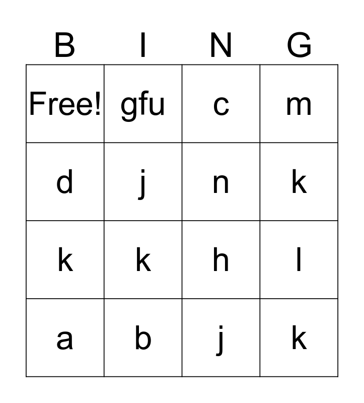 This bingo card has 16 words: a, b, c, m, d, gfu, h, l, Free!, j, j, k, k, k, n and k.