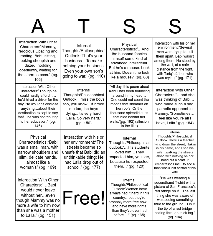 This bingo card has 16 words: Free!, Internal Thoughts/Philosophical Outlook:There’s a teacher living down the street, Hakim is his name, and I see his wife…walking the streets alone with nothing on her head but a scarf. It embarrasses me…to see a man who’s lost control of his wife, Physical Characteristics:‘…And the husband fancies himself some kind of advanced intellectual. But he’s a mouse. Look at him. Doesn’t he look like a mouse?’ (pg. 80), Interaction With Other Characters:“Mammy, ferocious…pacing and ranting; Babi, sitting, looking sheepish and dazed, nodding obediently, waiting for the storm to pass.” (pg. 108), Physical Characteristics:“Babi was a small man, with narrow shoulders and slim, delicate hands, almost like a woman’s” (pg. 109), Internal Thoughts/Philosophical Outlook:‘That’s your business…To make nothing your business. Even your own son’s going to war.’ (pg. 110), Internal Thoughts/Philosophical outlook:‘…His students loved him…They respected him, you see, because he respected them…’ (pg. 120), Internal Thoughts/Philosophical Outlook:‘Women have always had it hard in this country…but they’re probably more free now…and have more rights than they’ve ever had before….” (pg. 135), Interaction With Other Characters:“Though he could hardly afford it…he’d hired a driver for the day. He wouldn’t disclose anything…about their destination except to say that…he was contributing to her education.” (pg. 146), Internal Thoughts/Philosophical Outlook:‘I miss the boys too, you know…it broke me too, the boys dying...It’s very hard, Laila. So very hard.’ (pg. 150), Interaction With Other Characters:“…Babi would never leave without her…even though Mammy was no more a wife to him now than she was a mother to Laila.” (pg. 151), Interaction with his or her environment:“Several men were trying to pull them apart. Babi wasn’t among them. He stood by the wall, at a safe distance from the fight, with Tariq’s father, who was crying.” (pg. 171), Interaction with his or her environment:“The streets became so unsafe that Babi did an unthinkable thing: He had Laila drop out of school.” (pg. 177), Interaction With Other Characters:“…and she was thinking of Babi…who made such a sad, pathetic opponent to Mammy. ‘Sometimes…I feel like you’re all I have, Laila.’ (pg. 184), “All day, this poem about Kabul has been bouncing around in my head… ‘One could not count the moons that shimmer on her roofs, Or the thousand splendid suns that hide behind her walls.’(pg. 192) (allusion to the title) and “He was wearing a secondhand T-shirt with a picture of San Francisco’s red bridge on it…The last thing she was aware of was seeing something thud to the ground…On it, the tip of a red bridge poking through thick fog.” (pg. 194).