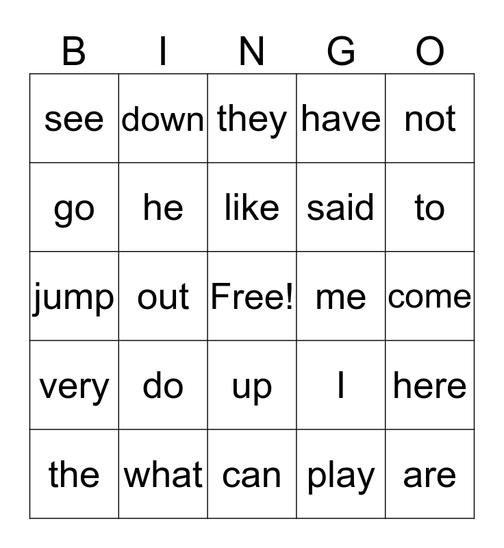 This bingo card has a free space and 48 words: a, are, and, can, do, does, down, for, go, has, he, have, here, I, is, look, like, me, my, not, out, play, see, said, school, to, the, they, up, very, where, we, was, with, what, you, be, come, good, pull, fun, make, they, too, jump, move, run and two.