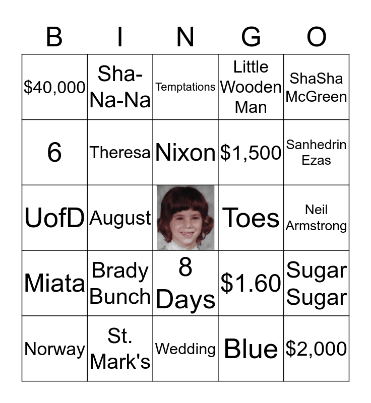 This bingo card has a free space and 34 words: Puppy, Blue, Sesame Street, James Madison Fellowship, Miata, Theresa, ShaSha McGreen, Norway, Sha-Na-Na, 32-cents, Nixon, Temptations, Hamster, Fuzzy, Toes, Sanhedrin Ezas, St. Mark's, UofD, Brady Bunch, $1.60, 8 Days, Max Yasgur, $40,000, Neil Armstrong, Wedding, $2,000, Little Wooden Man, Servian Gourt, $1,500, 6, 3, August, Sugar Sugar and Butch Cassidy and the Sundance Kid.