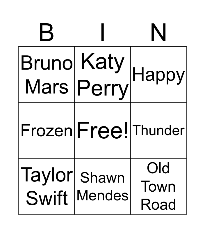 This bingo card has a free space and 8 words: Thunder, Happy, Katy Perry, Taylor Swift, Bruno Mars, Old Town Road, Frozen and Shawn Mendes.