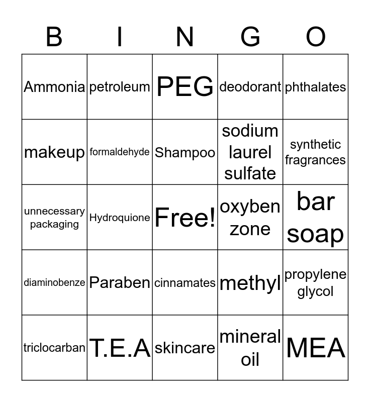 This bingo card has a free space and 24 words: Paraben, T.E.A, Shampoo, triclocarban, phthalates, Ammonia, makeup, petroleum, oxyben zone, cinnamates, sodium laurel sulfate, unnecessary packaging, methyl, propylene glycol, formaldehyde, mineral oil, bar soap, PEG, synthetic fragrances, Hydroquione, MEA, diaminobenze, deodorant and skincare.