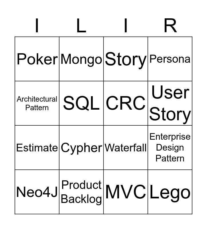 This bingo card has 48 words: Neo4J, Neo4J, Agile, Sprint, Software Development, Design Pattern, Mongo, Database, SQL, REST, CRC, Persona, Alan Cooper, Maven, Velocity, Jira, User Story, Product Backlog, Product Owner, Architectural Pattern, Enterprise Design Pattern, Plane, Poker, Estimate, Demo, Cypher, Product Owner, Burndown, Scrum, Lego, Github/Git, Starter Code, Midterm, Handout, Spring, Done, MEAN, MVC, Object Oriented, Architecture, Cohesion, Coupling, Story, Scenarios, Waterfall, JSON, NoSQL and Methodology.