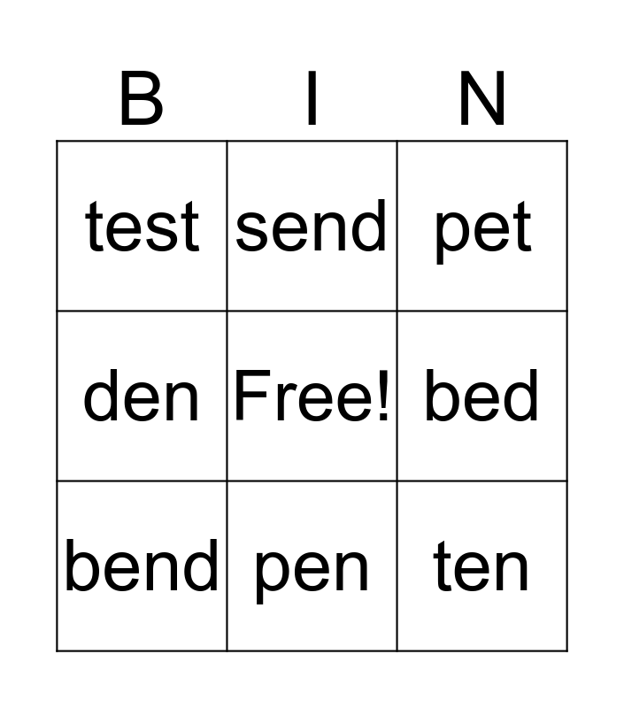 This bingo card has a free space and 8 words: bed, pet, send, bend, test, ten, den and pen.