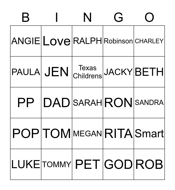 This bingo card has a free space and 29 words: LUKE, MOM, DAD, WILLIE, ANGIE, RALPH, JEN, TOM, RON, TOMMY, SANDRA, ROB, PET, GOD, BETH, BOOTH, MEGAN, POP, CHARLEY, PP, RITA, JESUS, JACKY, PAULA, Robinson, Love, Smart, Texas Childrens and out going.