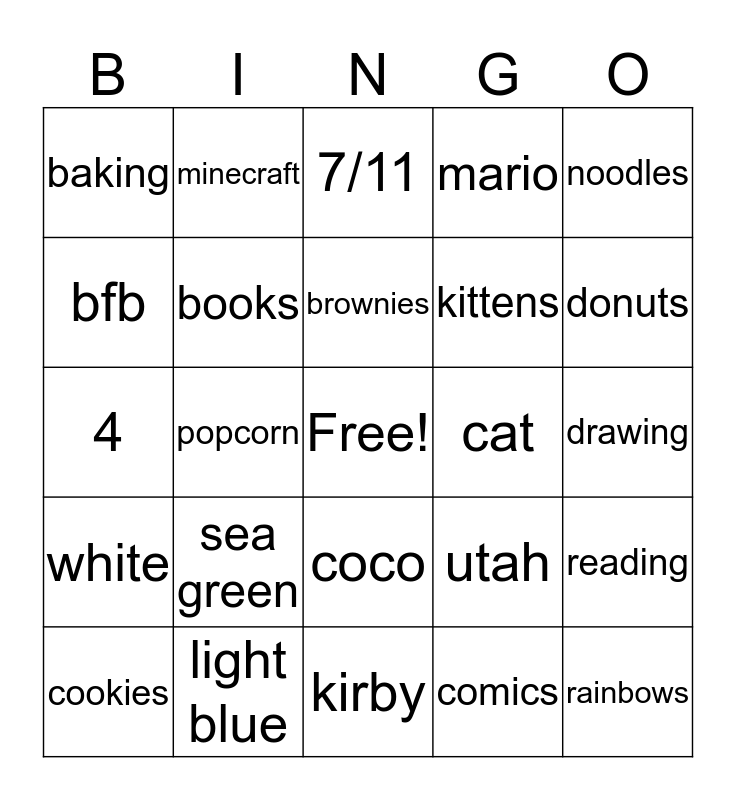 This bingo card has a free space and 24 words: sea green, light blue, brownies, cookies, noodles, baking, bfb, minecraft, cat, coco, kittens, 4, utah, reading, books, comics, drawing, 7/11, donuts, popcorn, rainbows, white, mario and kirby.