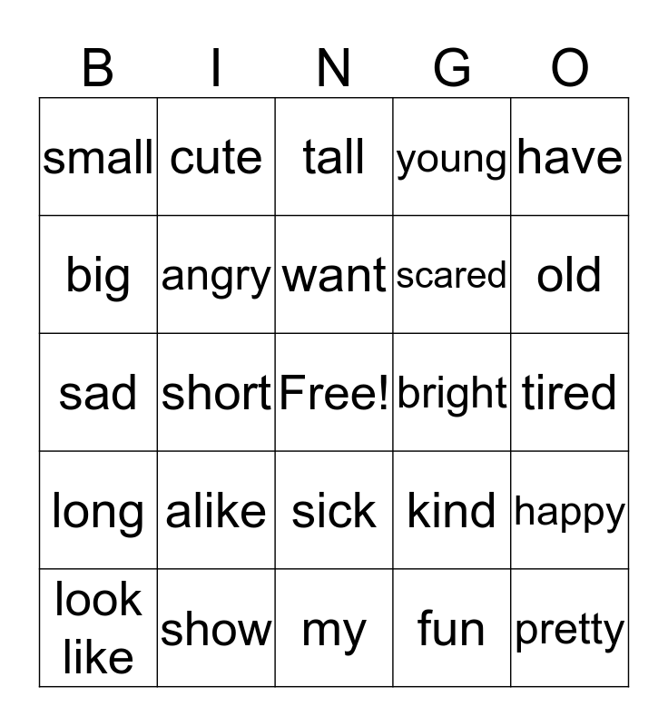 This bingo card has a free space and 24 words: alike, show, want, look like, have, small, big, cute, bright, sick, scared, sad, kind, happy, angry, fun, tired, tall, old, short, pretty, long, young and my.