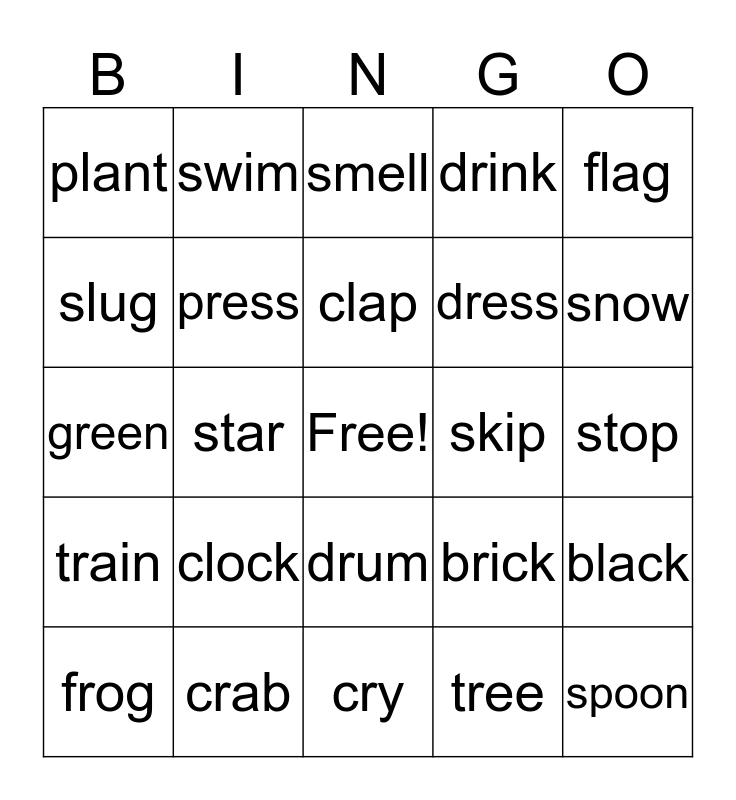 This bingo card has a free space and 24 words: clock, crab, clap, frog, flag, plant, slug, swim, skip, drum, dress, green, brick, black, press, tree, stop, smell, snow, star, spoon, train, drink and cry.