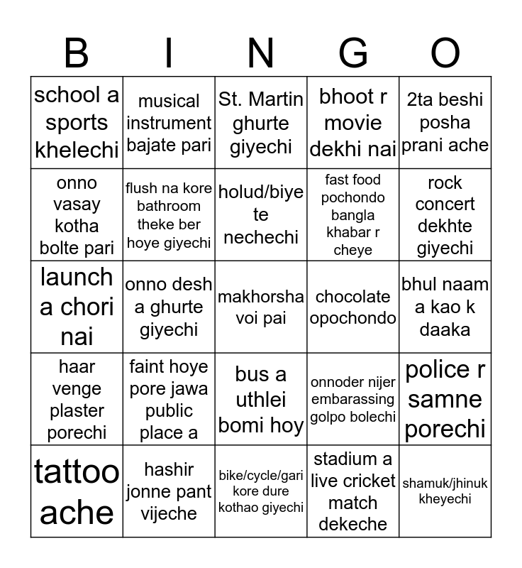 This bingo card has 25 words: haar venge plaster porechi, hashir jonne pant vijeche, makhorsha voi pai, stadium a live cricket match dekeche, 2ta beshi posha prani ache, school a sports khelechi, musical instrument bajate pari, St. Martin ghurte giyechi, chocolate opochondo, police r samne porechi, onno vasay kotha bolte pari, flush na kore bathroom theke ber hoye giyechi, bike/cycle/gari kore dure kothao giyechi, onnoder nijer embarassing golpo bolechi, rock concert dekhte giyechi, tattoo ache, onno desh a ghurte giyechi, holud/biye te nechechi, fast food pochondo bangla khabar r cheye, bhul naam a kao k daaka, launch a chori nai, faint hoye pore jawa public place a, bus a uthlei bomi hoy, bhoot r movie dekhi nai and shamuk/jhinuk kheyechi.