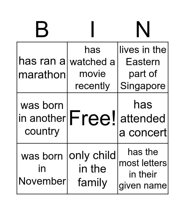 This bingo card has a free space and 40 words: was born in March, was born in August, was born in September, was born in November, was born in December, prefers tea instead of coffee, only child in the family, can whistle, has the most letters in their given name, is of the same height as you, can play a musical instrument, was born in another country, is left-handed, speaks 2 or more languages, has kept the 2019 resolution till date, loves to travel to Africa, owns a pet, has ran a marathon, cannot take spicy food, lives in the Eastern part of Singapore, has two or more children, has a driving license, has played a team sport, has attended a concert, has fractured a bone, is an extrovert, is an introvert, loves dark chocolate, is allergic to seafood, likes reading, likes to sing karoke, does not know how to swim, is wearing a spectacle, was born the 11th of the month, mobile number starts with ‘8’, lives in the Central part of Singapore, loves to exercise, hates durian, has watched a movie recently and loves to cook.