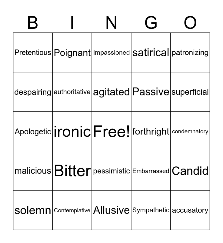 This bingo card has a free space and 39 words: cynical, disgruntled, sharp, authoritative, solemn, pessimistic, agitated, condescending, patronizing, malicious, ironic, satirical, accusatory, condemnatory, forthright, Bitter, Vexed, Pretentious, Admonitory, Embarrassed, despairing, Allusive, Passive, superficial, apathetic, Inquisitive, Incredulous, melancholy, mournful, Poignant, Sentimental, Amused, Impassioned, Contemplative, Sympathetic, Enthusiastic, Candid, Apologetic and Reflective.