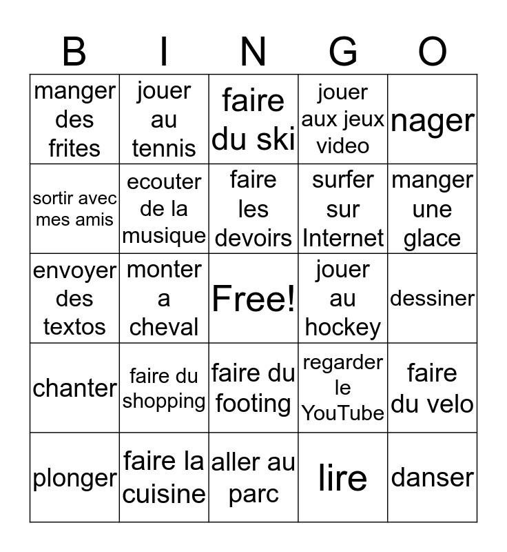 This bingo card has a free space and 24 words: faire du shopping, faire la cuisine, faire les devoirs, plonger, nager, manger des frites, sortir avec mes amis, jouer au tennis, jouer au hockey, faire du footing, surfer sur Internet, envoyer des textos, regarder le YouTube, faire du velo, ecouter de la musique, lire, dessiner, faire du ski, manger une glace, monter a cheval, danser, chanter, jouer aux jeux video and aller au parc.