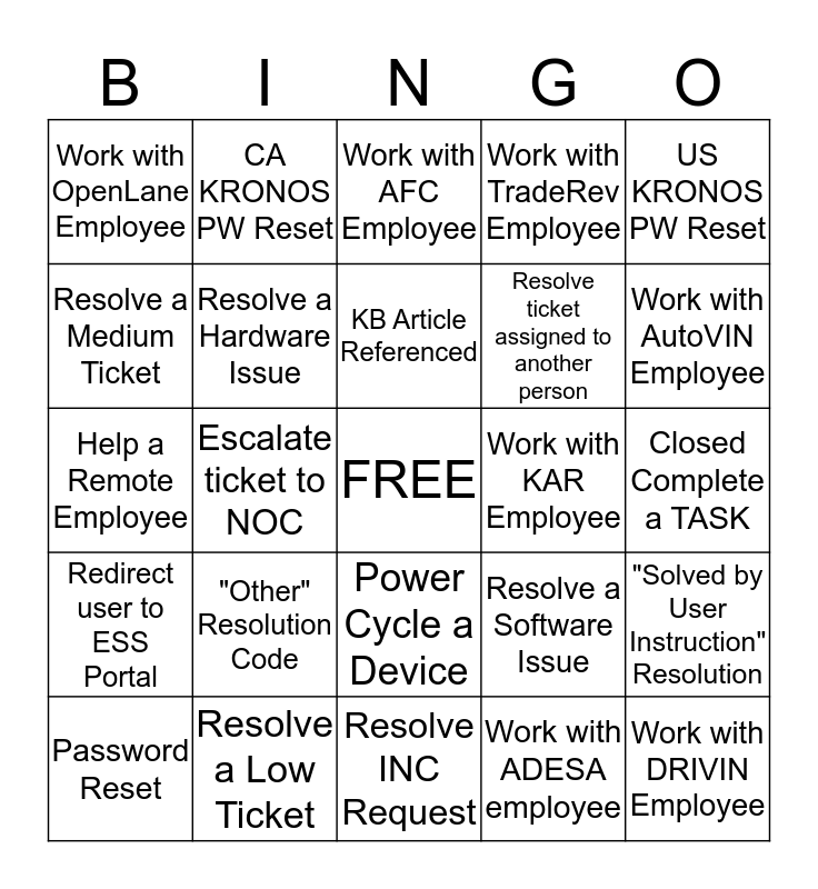 This bingo card has a free space and 24 words: Password Reset, "Other" Resolution Code, KB Article Referenced, Work with ADESA employee, US KRONOS PW Reset, Work with OpenLane Employee, CA KRONOS PW Reset, Work with AFC Employee, Work with KAR Employee, Closed Complete a TASK, Help a Remote Employee, Resolve a Hardware Issue, Resolve a Software Issue, "Solved by User Instruction" Resolution, Resolve a Medium Ticket, Resolve a Low Ticket, Resolve INC Request, Work with TradeRev Employee, Work with AutoVIN Employee, Redirect user to ESS Portal, Escalate ticket to NOC, Power Cycle a Device, Resolve ticket assigned to another person and Work with DRIVIN Employee.