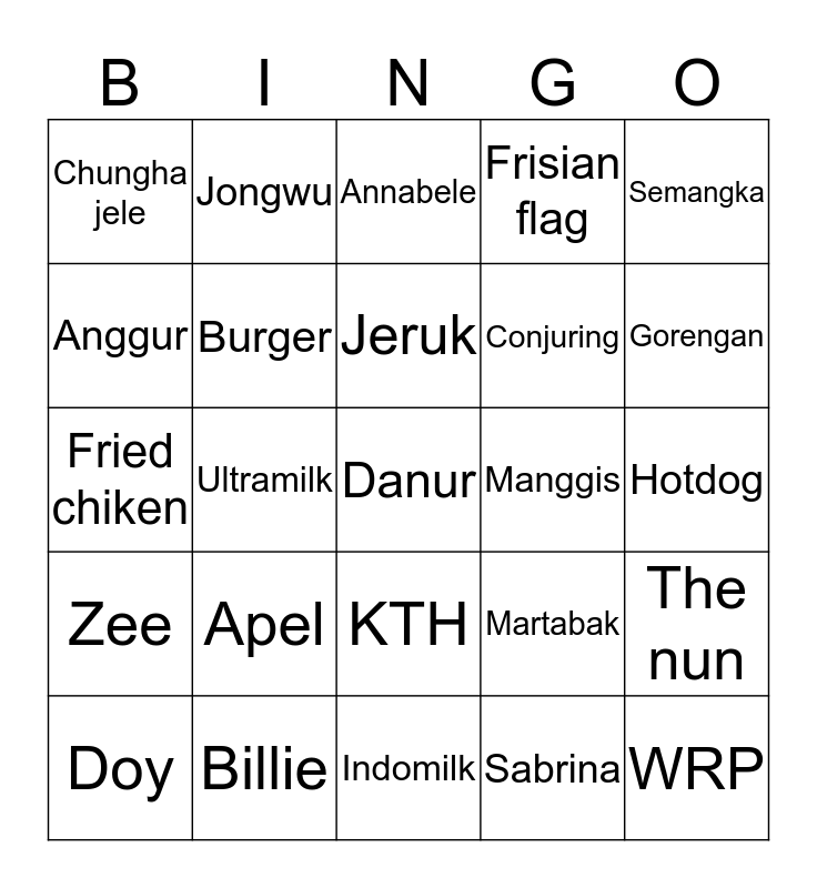 This bingo card has a free space and 24 words: Apel, Billie, Jeruk, Doy, Semangka, Chungha jele, Anggur, Jongwu, Manggis, KTH, Conjuring, Fried chiken, Martabak, The nun, Burger, Sabrina, Hotdog, Annabele, Gorengan, Ultramilk, WRP, Zee, Frisian flag and Indomilk.