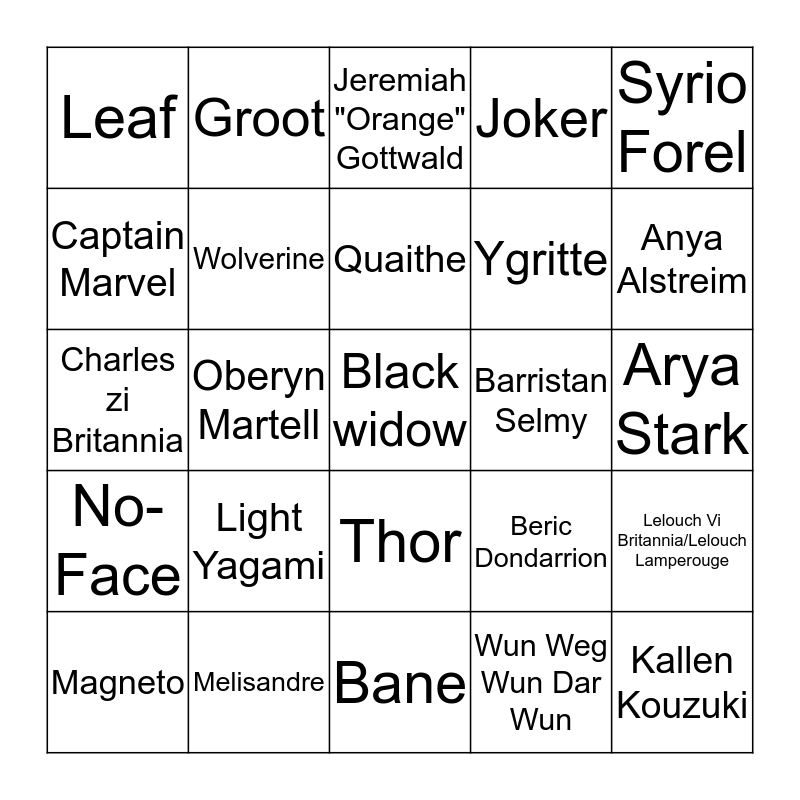 This bingo card has 100 words: Eddard "Ned" Stark, Sansa Stark, Arya Stark, Bran Stark, Jon Snow, Robert Baratheon, Jaime Lannister, Cersei Lannister, Daenerys Targaryen, Sandor "The Hound" Clegane, Tyrion Lannister, Khal Drogo, Petyr "Littlefinger" Baelish, Melisandre, Varys, Margaery Tyrell, Ygritte, Tormund Giantsbane, Brienne of Tarth, Daario Naharis, Missandei, Jaqen H'ghar, Grey Worm, Hodor, Gregor "The Mountain" Clegane, Barristan Selmy, Syrio Forel, Beric Dondarrion, Pyat Pree, Qyburn, Oberyn Martell, Leaf, Night King, Areo Hotah, Wun Weg Wun Dar Wun, Quaithe, Lelouch Vi Britannia/Lelouch Lamperouge, Suzaku Kururugi, C.C., Kallen Kouzuki, Rakshata Chawla, Diethard Ried, Charles zi Britannia, Bismarck Waldstein, Anya Alstreim, Jeremiah "Orange" Gottwald, Zero, Li Xingke, Aquaman, Bane, Batman, Catwoman, Darksied, Deadshot, Deathstroke, Flash, Gorilla Grodd, Green Lantern, Harley Quinn, Joker, Katana, Lex Luthor, Martian Manhunter, Poison Ivy, Ra's Al Ghul, Riddler, Shazam, Superman, Wonder Woman, L/Ryuzaki/Hideki Ryuga, Ryuk, Light Yagami, Misa Amane, N/Nate "Near" Rivers, M/Mihael "Mello" Keehl, Rem, Gelus, Captain Marvel, Thanos, Black Panther, Captain America, Black widow, Hulk, Thor, Doctor Strange, Groot, Loki, Yubaba, Kamaji, No-Face, Professor X, Beast, Jean Grey, Magneto, Wolverine, Deadpool, Night Crawler, Mystique, Rogue and Storm.