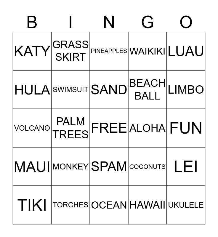 This bingo card has a free space and 25 words: MONKEY, OCEAN, SAND, TIKI, LUAU, KATY, HULA, GRASS SKIRT, ALOHA, SPAM, BEACH BALL, VOLCANO, COCONUTS, LEI, SWIMSUIT, WARM, FUN, PINEAPPLES, LIMBO, PALM TREES, UKULELE, TORCHES, MAUI, WAIKIKI and HAWAII.