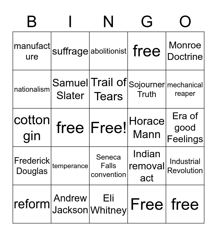 This bingo card has a free space and 24 words: reform, temperance, Trail of Tears, Free, Monroe Doctrine, manufact ure, suffrage, abolitionist, Horace Mann, Era of good Feelings, cotton gin, Samuel Slater, Indian removal act, Industrial Revolution, nationalism, Andrew Jackson, Eli Whitney, free, mechanical reaper, Frederick Douglas, free, Seneca Falls convention, Sojourner Truth and free.