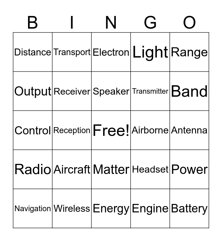 This bingo card has a free space and 29 words: Navigation, Connection, Reception, Generator, Distance, Electron, Receiver, Aircraft, Airborne, Wireless, Antenna, Battery, Energy, Engine, Band, Spectrum, Matter, Radio, Range, Control, Headset, System, Transmitter, Output, Light, Transport, Power, Speaker and Electron.