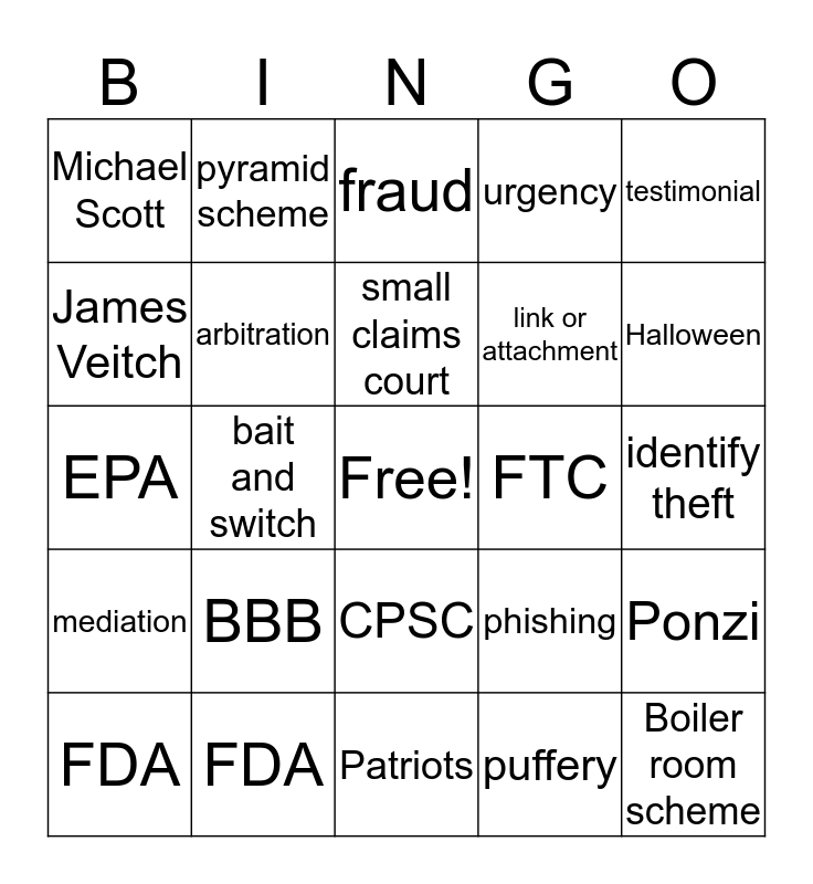 This bingo card has a free space and 32 words: puffery, loss leader, bait and switch, trading up, mediation, arbitration, testimonial, Ponzi, pyramid scheme, class-action suit, small claims court, fraud, deception, MSRP, FTC, UPC, FDA, EPA, CPSC, BBB, phishing, shoulder surfing, identify theft, FDA, Boiler room scheme, urgency, link or attachment, James Veitch, Michael Scott, Patriots, homecoming and Halloween.