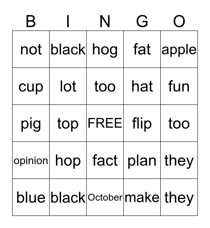 This bingo card has a free space and 29 words: blue, log, top, hot, not, hog, lot, hop, flip, black, too, they, October, make, fun, favorite, fact, opinion, apple, pig, plan, cat, hat, cup, fat, black, they, too and school.