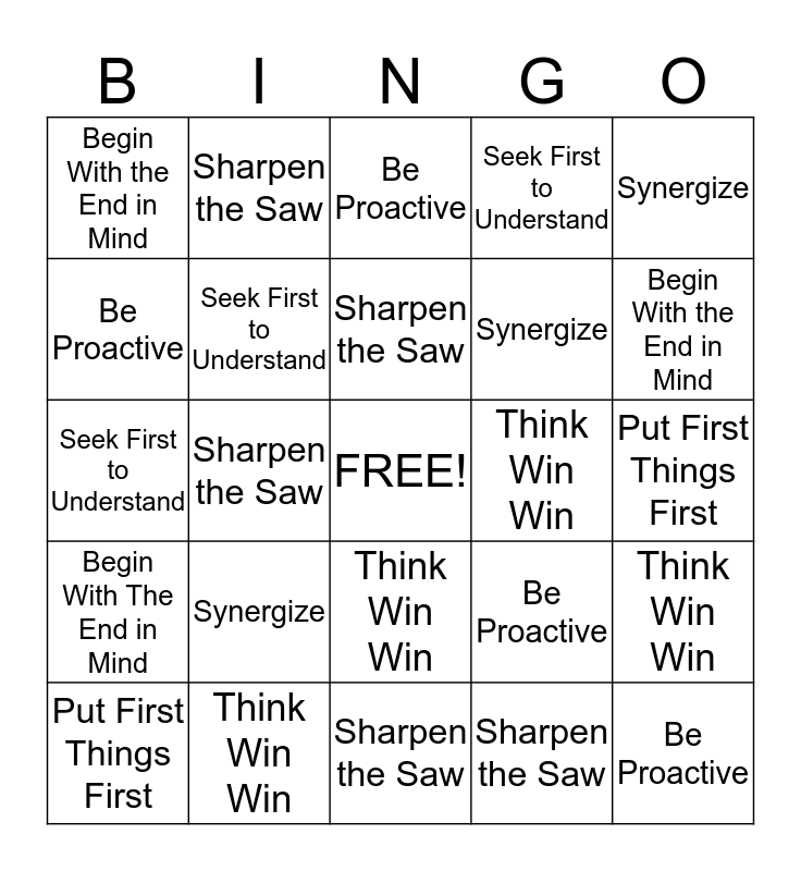 ⚠ This card has duplicate items: Synergize (3), Think Win Win (4), Sharpen the Saw (5), Put First Things First (2), Begin With the End in Mind (2), Be Proactive (4), Seek First to Understand (2)