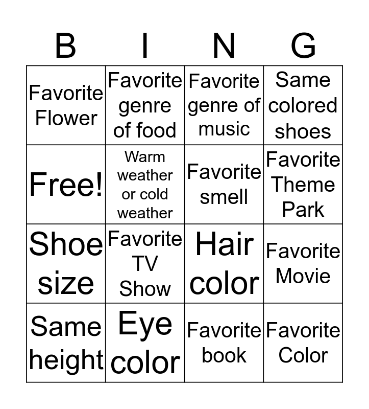 This bingo card has 16 words: Eye color, Favorite Movie, Favorite genre of music, Favorite Flower, Shoe size, Favorite genre of food, Hair color, Favorite book, Free!, Warm weather or cold weather, Same height, Same colored shoes, Favorite TV Show, Favorite Theme Park, Favorite smell and Favorite Color.
