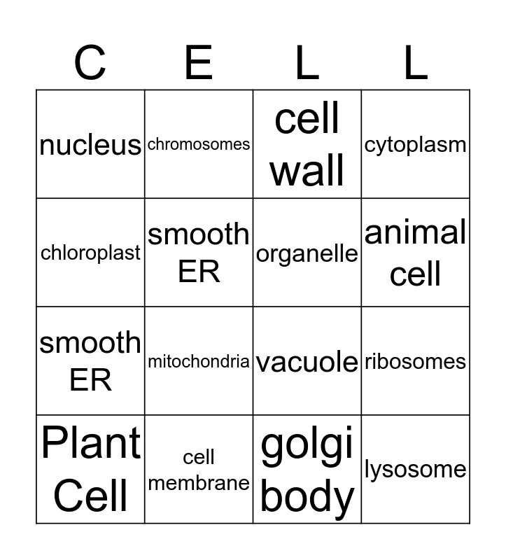 This bingo card has 16 words: cell membrane, ribosomes, cell wall, nucleus, smooth ER, chromosomes, vacuole, golgi body, chloroplast, smooth ER, Plant Cell, cytoplasm, mitochondria, animal cell, organelle and lysosome.
