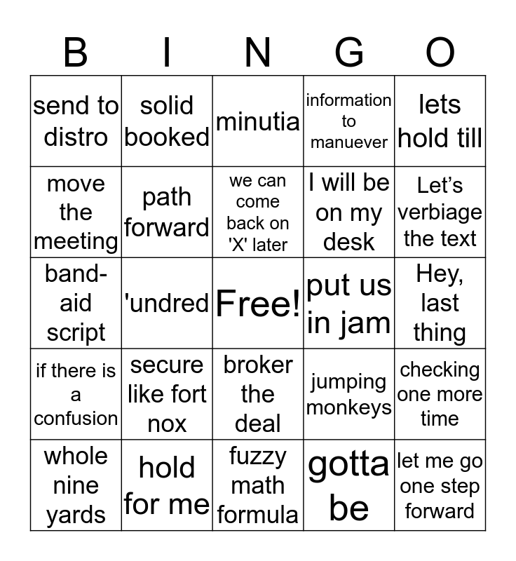 This bingo card has a free space and 29 words: whole nine yards, disposition, 'undred, take an action item, send to distro, minutia, path forward, secure like fort nox, put us in jam, hold for me, Hey, last thing, let me go one step forward, fuzzy math formula, gotta be, Let’s verbiage the text, few minutes tomm., broker the deal, if there is a confusion, lets hold till, band-aid script, jumping monkeys, go from there, I will be on my desk, move the meeting, information to manuever, solid booked, checking one more time, we can come back on 'X' later and remove his/her test case.