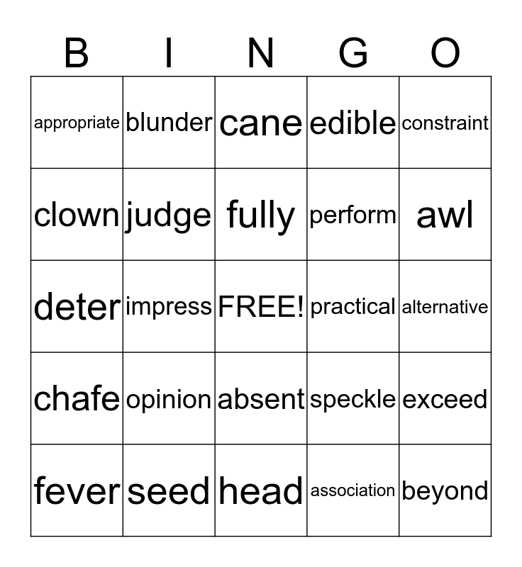 This bingo card has a free space and 30 words: seed, qualified, impress, mute, appropriate, cane, judge, absent, practical, head, alternative, beyond, association, respect, awl, battle, speckle, chafe, opinion, constraint, deter, administer, blunder, perform, clown, edible, exceed, fever, fully and material.