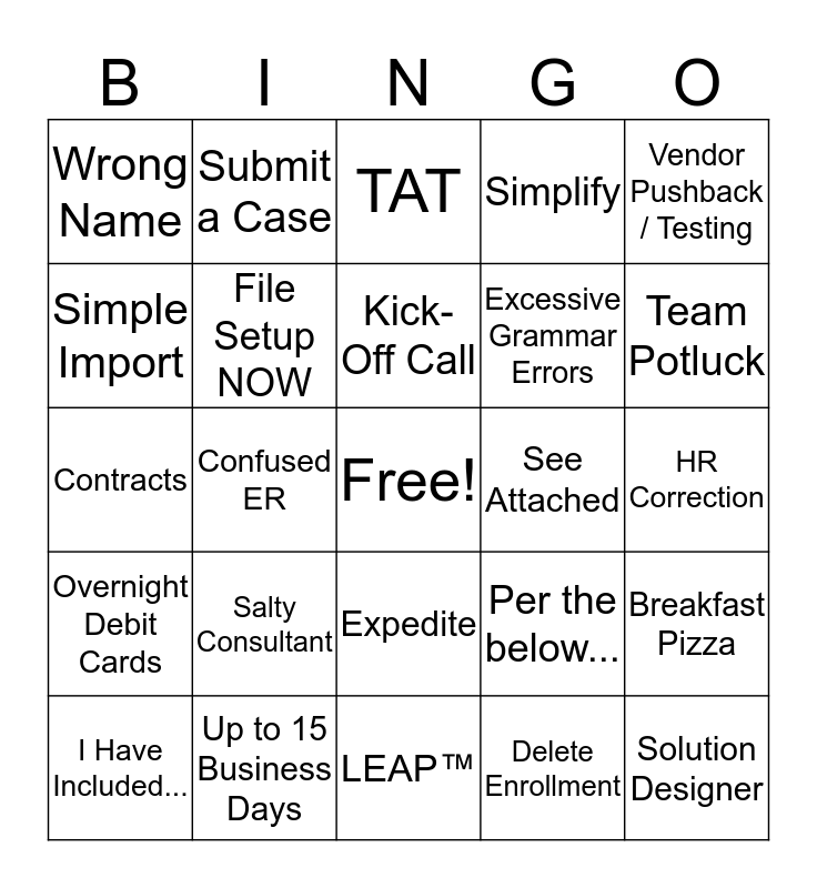 This bingo card has a free space and 24 words: Salty Consultant, Up to 15 Business Days, Kick-Off Call, I Have Included..., Vendor Pushback / Testing, Wrong Name, Simple Import, Submit a Case, See Attached, Expedite, Excessive Grammar Errors, Contracts, Per the below..., Breakfast Pizza, File Setup NOW, Delete Enrollment, HR Correction, TAT, Team Potluck, Confused ER, Solution Designer, Overnight Debit Cards, Simplify and LEAP™.