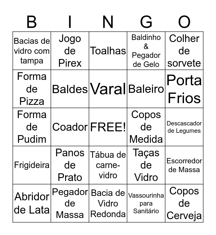 This bingo card has a free space and 55 words: Abridor de Garrafa, Abridor de Lata, Avental, Bacias de vidro com tampa, Bacia de Vidro Redonda, Bacia de Vidro Quadrada, Baldes, Baldinho de Pegador de Gelo, Baleiro, Bombeiro, Baldinho & Pegador de Gelo, Cabides, Canecas, Cesto de Roupa, Cesto para Pão, Colher de Pau, Colher de sorvete, Coador, Concha, Copos de Cerveja, Copos de Medida, Copos de Vidro, Taças de Vidro, Toalhas, Toalhas de Mesa, Varal, Vassourinha para Sanitário, Xícaras, Descascador de Legumes, Escorredor de Massa, Espremedor de Alho, Espumadeira, Faca para Pão, Faca para manteiga, Forma de Pizza, Forma de Pudim, Formas de Gelo, Frigideira, Jarra de Vidro, Jogo Americano, Jogo de Pirex, Leiteira, Pá, Panos de chão, Panos de Prato, Pegador de Massa, Pegador de Salada, Potes de Plástico, Porta Guardanapos, Porta Frios, Prendedores de Roupa, Ralador, Saleiro, Tábua de carne-vidro and Taças de Sorvete.