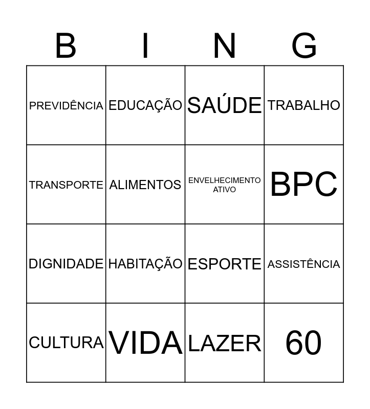 This bingo card has 16 words: VIDA, ASSISTÊNCIA, SAÚDE, PREVIDÊNCIA, DIGNIDADE, EDUCAÇÃO, ESPORTE, LAZER, TRANSPORTE, ALIMENTOS, CULTURA, TRABALHO, HABITAÇÃO, BPC, ENVELHECIMENTO ATIVO and 60.