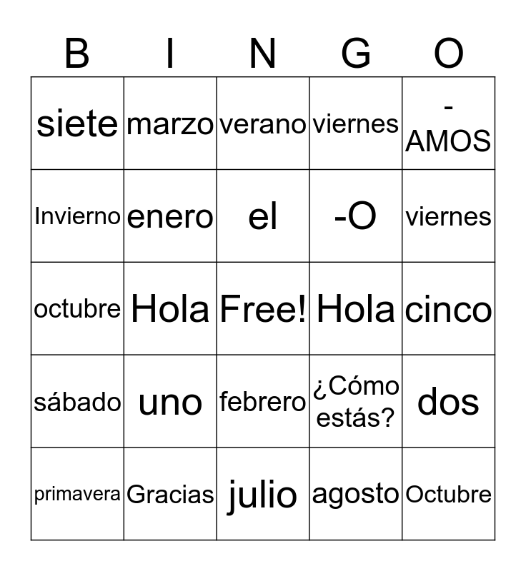 This bingo card has a free space and 52 words: martes, uno, Buenos días, Otoño, cinco, -A, marzo, ¿Cómo te llamas?, -O, Octubre, Invierno, ¿Qué tal?, Buenas noches, dos, lunes, -AS, el, ¿Cómo estás?, Primavera, siete, Hola, diez, viernes, -AMOS, lunes, martes, miércoles, jueves, viernes, sábado, domingo, verano, otoño, invierno, primavera, enero, febrero, marzo, abril, mayo, junio, julio, agosto, septiembre, octubre, noviembre, diciembre, Hola, ¿Cómo te llamas?, Mucho gusto, Gracias and De nada.