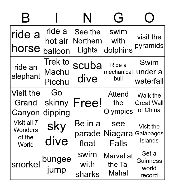 This bingo card has a free space and 24 words: sky dive, bungee jump, scuba dive, snorkel, visit the pyramids, ride a horse, ride an elephant, ride a hot air balloon, Attend the Olympics, Be in a parade float, Ride a mechanical bull, Visit the Grand Canyon, see Niagara Falls, Visit the Galápagos Islands, Trek to Machu Picchu, Marvel at the Taj Mahal, Walk the Great Wall of China, See the Northern Lights, Swim under a waterfall, Go skinny dipping, Set a Guinness world record, Visit all 7 Wonders of the World, swim with dolphins and swim with sharks.