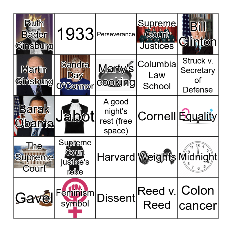 This bingo card has 15 images, a free space and 24 words: Supreme Court justice's robe, Feminism symbol, Marty's cooking, Gavel, Bill Clinton, Ruth Bader Ginsburg, Martin Ginsburg, 1933, Cornell, Harvard, Columbia Law School, Barak Obama, Weights, Midnight, Sandra Day O'Connor, Reed v. Reed, Equality, Perseverance, Struck v. Secretary of Defense, Jabot, Colon cancer, The Supreme Court, Supreme Court Justices and Dissent.