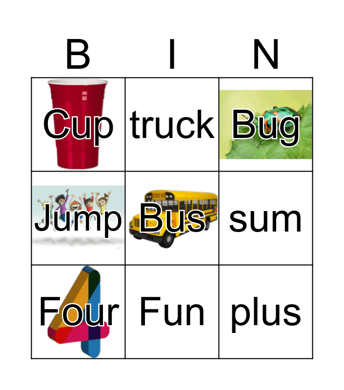 This bingo card has 8 images, a free space and 17 words: Sun, Gum, Bug, Cup, Stuck, Jump, Tub, Four, Fun, sum, rug, pup, plus, truck, lump, scrub and hunt.