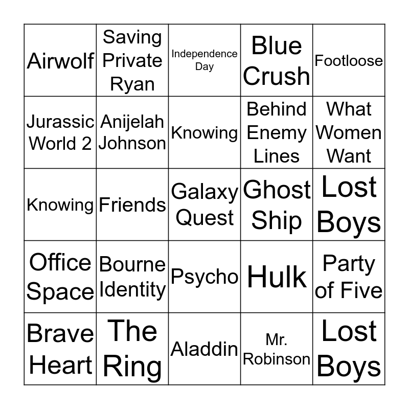 This bingo card has 55 words: A Few Good Men, Brave Heart, Across the Universe, Airwolf, Aladdin, Along Came a Spider, Anijelah Johnson, The Great Wall, Behind Enemy Lines, Blade Runner, Blue Crush, Bosom Buddies, Cars, Goonies, Dr. Strangelove, Flash Gordon, Footloose, Friends, Full Metal Jacket, Galaxy Quest, Ghost Ship, Green Lantern, Hulk, Independence Day, Kindergarten Cop, Knowing, Mr. Robinson, Office Space, Lost Boys, Party of Five, Pee Wee's Big Adventure, Phone Booth, Red Eye, American Werewolf .. London, Jurassic World 2, Knowing, Mister Robinson, Office Space, Lost Boys, Party of Five, Saving Private Ryan, Seven Psychopaths, 2 1/2 Men, the Accused, Bourne Identity, The Ring, Three Amigos, Tommy Boy, Weird Science, What Women Want, A Fish Called Wanda, Game of Thrones, King Kong, Psycho and Whitney Cummings.
