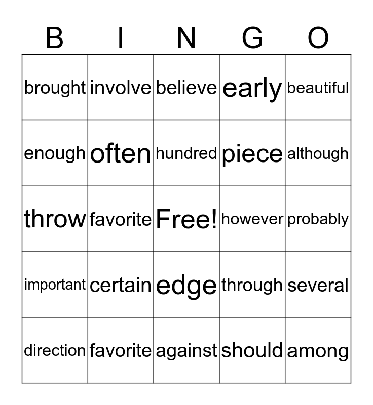 This bingo card has a free space and 24 words: certain, favorite, hundred, direction, beautiful, brought, enough, involve, however, edge, piece, throw, through, several, often, should, probably, believe, although, favorite, among, important, early and against.