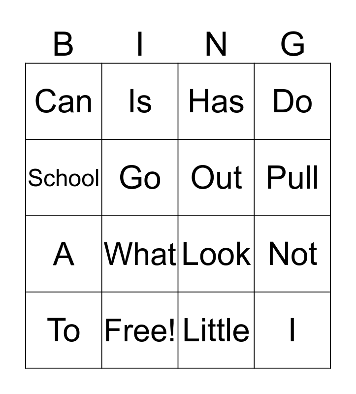This bingo card has 16 words: Free!, Not, Has, Can, A, Is, Look, Little, School, Go, To, Do, What, Pull, Out and I.