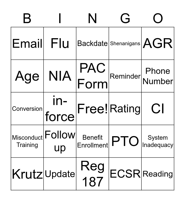 This bingo card has a free space and 29 words: Krutz, Keep Together, in-force, Texas, Email, Backdate, NIA, Follow up, Rating, Update, CI, Reading, Reg 187, ECSR, Phone Number, Flu Shot, Benefit Enrollment, Misconduct Training, AGR, Conversion, PTO, Halloween, Reminder, Age, Shenanigans, Flu, System Inadequacy, PAC Form and Pre-Q.