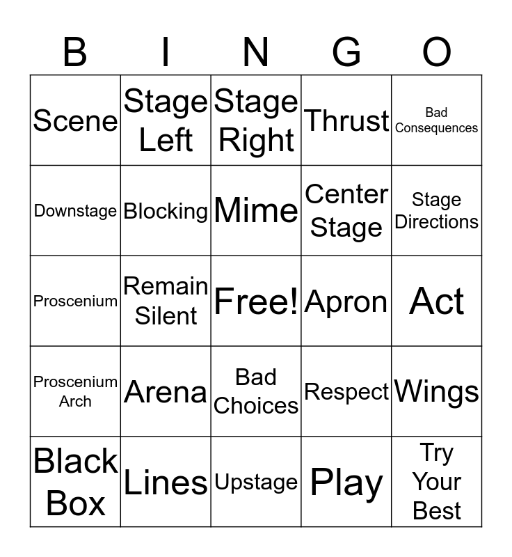 This bingo card has a free space and 27 words: Respect, Audience Etiquette, Center Stage, Upstage, Downstage, Stage Right, Stage Left, Proscenium Arch, Apron, Wings, Proscenium, Thrust, Black Box, Lines, Stage Directions, Cheating Out, Blocking, Mime, Arena, Scene, Act, Play, Remain Silent, Try Your Best, Bad Choices, Bad Consequences and Hand Over Cell Phone.